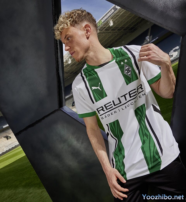 新赛季的主客场球衣,在保留门兴格拉德巴赫标志性的黑、白、绿经典色彩搭配的同时,巧妙融合了复古风情与现代审美,展现出前所未有的视觉冲击力。主场球衣的设计灵感源自俱乐部辉煌的1974-75赛季,那段由亨内斯·魏斯魏勒教练与贝尔蒂·福格茨队长共同书写的传奇岁月,至今仍激励着无数球迷与球员。球衣正面的宽阔绿色竖纹与纤细黑色竖纹交织,不仅勾勒出球队的传统色彩,更通过锥形元素的创新运用,微妙地致敬了欧洲联盟杯奖杯的独特形态,寓意着球队对荣耀的不懈追求与传承。