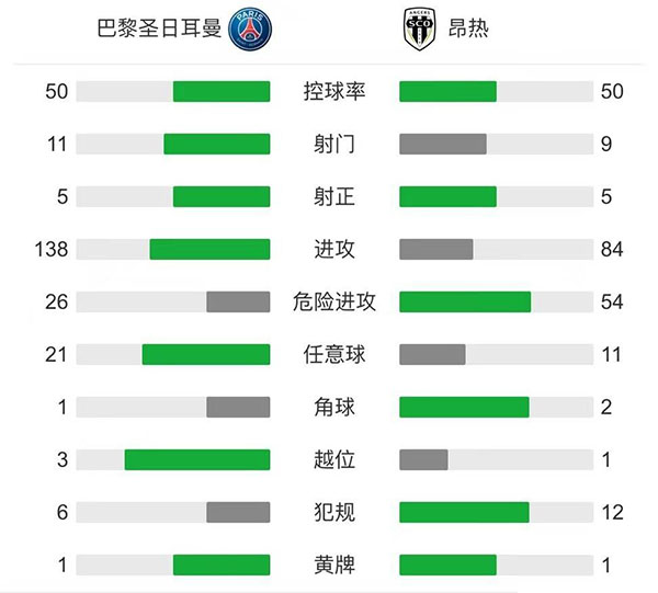 全场比赛结束,巴黎圣日耳曼5-0昂热。
