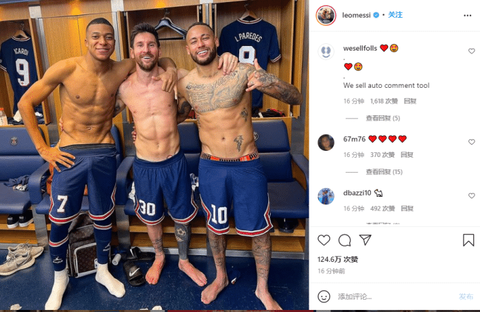 178直播9月29日讯 今天,梅西收获自己的巴黎生涯处子球,赛后他在Instagram上晒出MNM组合在更衣室的合照,并表示希望自己能为巴黎进更多球。