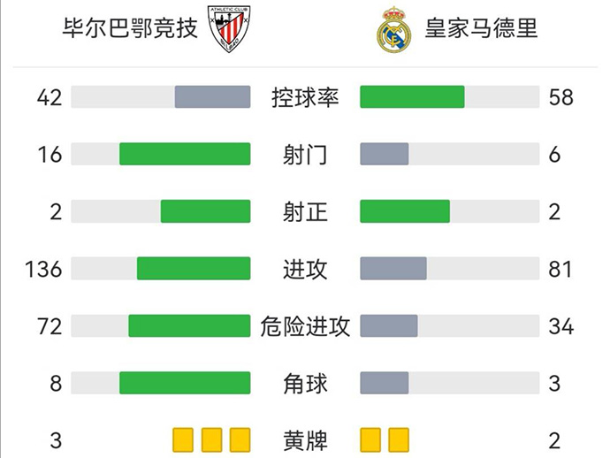 第93分钟,卡马文加长传到禁区内,伊斯科凌空扫射打偏了。全场比赛结束,皇家马德里客场0-1负于毕尔巴鄂竞技。