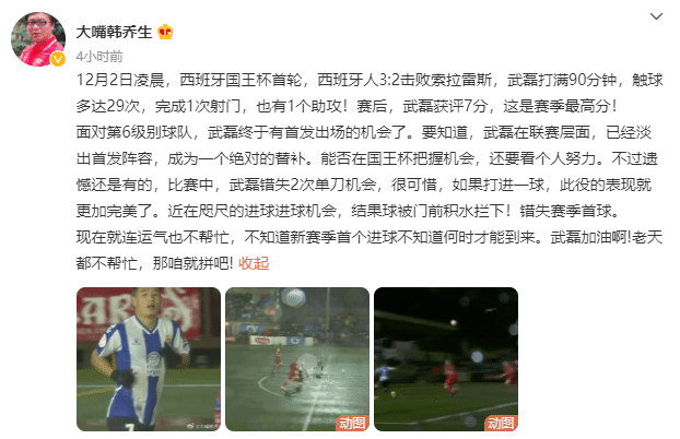 178直播12月02日讯 今天凌晨西班牙国王杯首轮,西班牙人3-2战胜索拉雷斯,武磊获得首发机会并送出助攻,但错过了一个进球机会,韩乔生对此感叹不已。