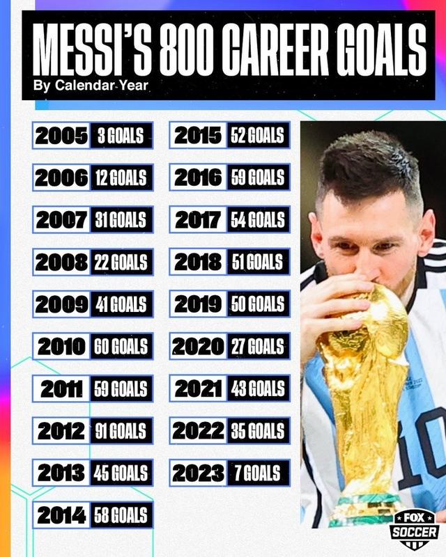 178直播讯03月24日,阿根廷在热身赛中2-0击败巴拿马,梅西在比赛中打进任意球,职业生涯进球数达到800球。以下为梅西生涯800球的各项分布: