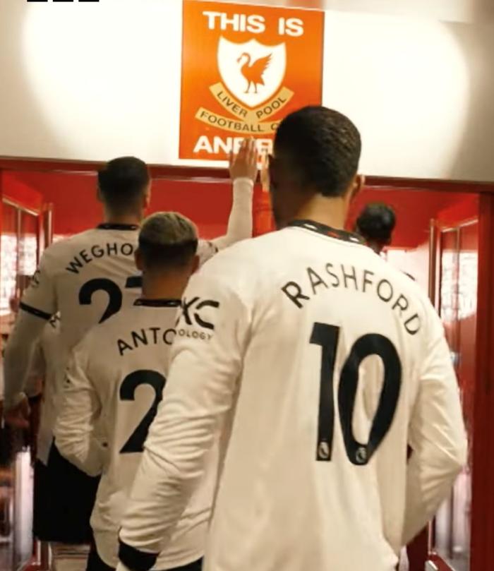 通常,只有利物浦球员会触摸安菲尔德的标志牌,例如在韦霍斯特之前走过的法比尼奥,以及与他同时走向球场的荷兰中卫范迪克。