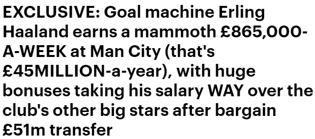 他的薪水远超曼城队友,算上基本稳定的巨额奖金,其周薪为86.5万英镑,年薪高达4500万。