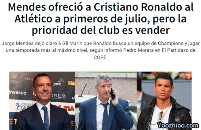 外媒报道称门德斯确实向马竞推销了C罗,要知道的是C罗可是皇马的传奇,马竞是皇马的同城死敌,而马竞方面的态度很直接,那就是拒绝提议,C罗的高薪不是现在的马竞可以承担的。包括马竞的球迷在社交媒体上纷纷抗议C罗加盟,他们也不喜欢C罗。