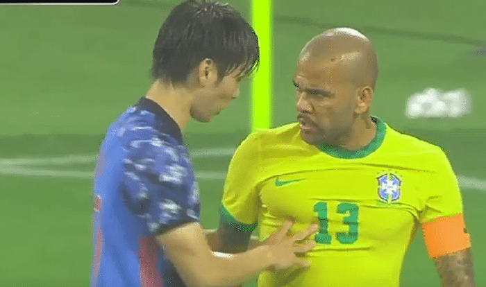上半场的比赛仅仅开始了2分钟的时间,巴西队就险些攻破日本队的球门,帕奎塔接内马尔脚后跟传球一脚劲射打在了门柱上,比赛第18分钟拉菲尼亚一脚远射被权田修一扑出,第22分钟日本队连续获得角球,远藤航头球攻门稍稍偏出,拉菲尼亚因为不满裁判吹罚领到黄牌,这也是本场比赛的第一张黄牌,第38分钟巴西队获得位置不错的任意球,拉菲尼亚的一脚劲射稍稍偏出,远藤航放倒维尼修斯领到黄牌,第41分钟内马尔一脚爆射被权田修一扑出,上半场比赛两队互交白卷。