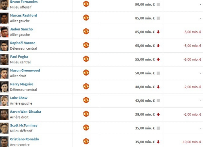 C罗的此次身价,相比上次降低了1000万欧元,在曼联队内排在第10位,与麦克托米奈相同。