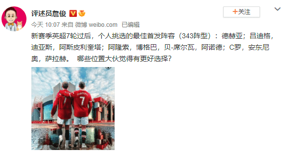 詹俊写道:“新赛季英超7轮过后,个人挑选的最佳首发阵容(343阵型):德赫亚;吕迪格,迪亚斯,阿斯皮利奎塔;阿隆索,博格巴,贝-席尔瓦,阿诺德;C罗,安东尼奥,萨拉赫。哪些位置大伙觉得有更好选择?”