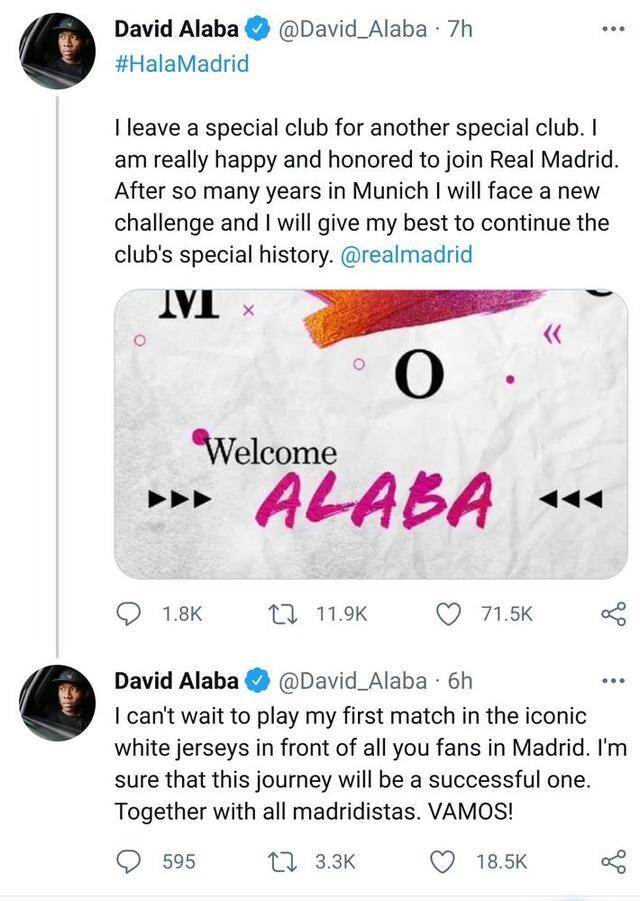 阿拉巴写道:“我离开一家特别的俱乐部,前往另一家特别的俱乐部。我很高兴也很荣幸能够加盟皇马,在慕尼黑生活了这么多年后,现在我将面临新的挑战了。我会付出全部,延续俱乐部的特殊历史。”