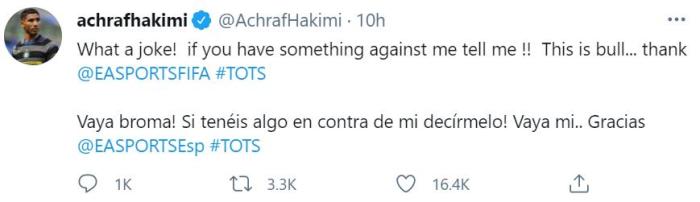 阿什拉夫写道:“真是一个笑话!如果你对我有意见,可以直接告诉我!真是放屁!谢谢@EASPORTSFIFA”