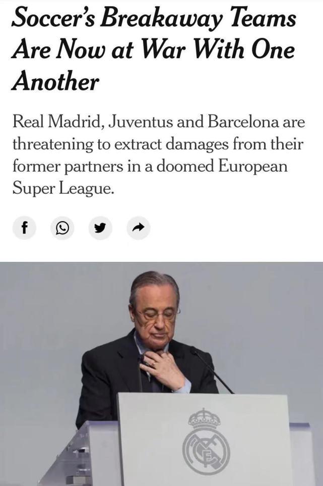 178直播讯 北京时间5月8日凌晨,来自《纽约时报》体育专栏记者Tariq Panja的报道,上月组建欧超联赛的12家俱乐部关系已经走向破裂,甚至“反目成仇”。其中仍然留在欧超的三家豪门皇家马德里、尤文图斯和巴塞罗那,依然拒绝让这个项目夭折。皇萨文三队还在一封公开信中表示,如果有任何球队按计划退出联盟,他们将对其他俱乐部采取法律行动,收取数百万美元的罚款。