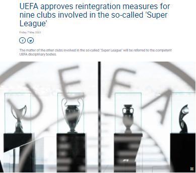 本着和解的精神和欧洲足球的利益,参与所谓的“超级联赛”的12个俱乐部中,已有9家向欧足联提交了俱乐部承诺宣言,阐明了俱乐部的立场,包括承诺参加UEFA俱乐部比赛和国家队比赛。