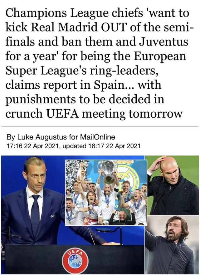 考虑到两队主席与欧足联糟糕的关系,欧足联确实存在下赛季对尤文和皇马在欧战禁赛的可能性。目前,皇马和尤文都稳居西甲和意甲积分榜的前四名,如果按照积分排名他们获得下赛季欧冠资格是没有太大悬念的。而如果没有欧超未能创建,届时又没有欧冠可踢,对于皇马和尤文两家世界顶级俱乐部来说,确实是个不小的打击。