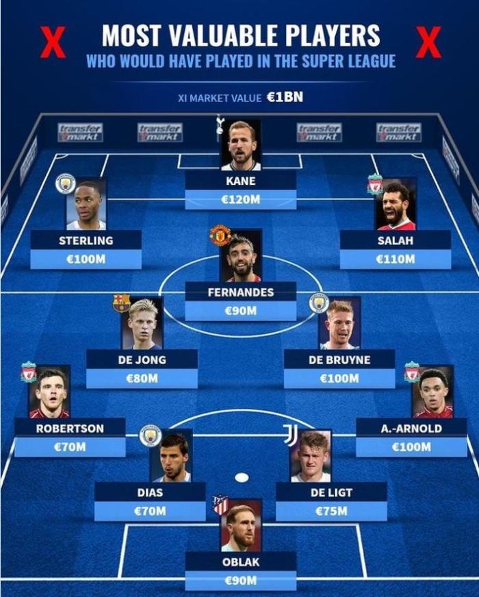 178直播讯今日,德国转会市场盘点了欧超联赛最贵阵容,利物浦三人入选最多,阵容总价达到10亿欧元。