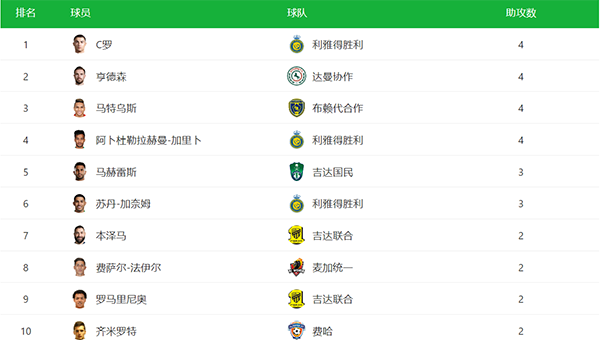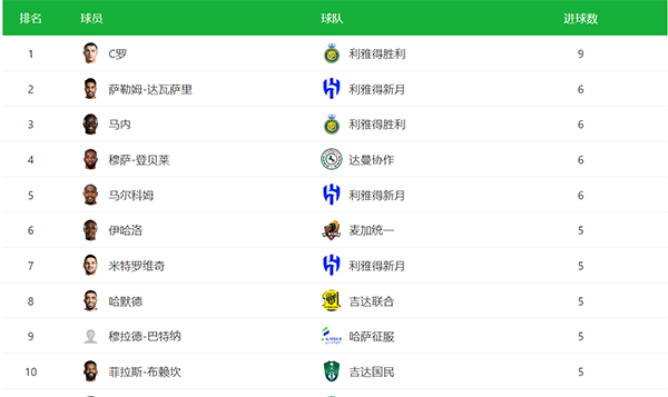 数据榜单上,C罗已经打进9个进球,排名第一,以马内和马尔科姆为首的一共4名球员打进6球,远远落后于C罗。助攻榜单,4名球员的助攻数都是4次,其中就包括C罗,足以看出C罗的全面性,老当益壮。