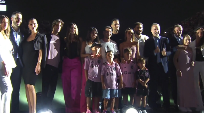 梅西和布斯克茨亮相之后,球员和管理层的家人们登台,一起互动、合影。可以看到贝克汉姆最小的孩子小七非常可爱,刚刚度过了12周岁生日的小七堪称是顶流,她长得很高,而且胖胖的和小时候一样可爱,站在爸爸贝克汉姆身前进行合影。