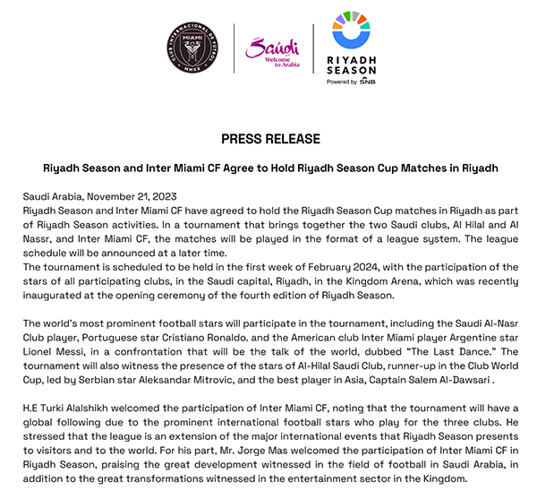 178直播11月22日梅西和C罗远离五大联赛之后,被认为交手的次数更少了,如今有消息传来,梅西和C罗将在俱乐部层面交手。这是明年2月在沙特举行的“利雅得赛季杯”官方消息,迈阿密国际将参加明年举行的利雅得赛季杯,除了迈阿密国际之外,这项赛事还有利雅得胜利与利雅得新月两队参加,梅西和C罗将再次同场对决。