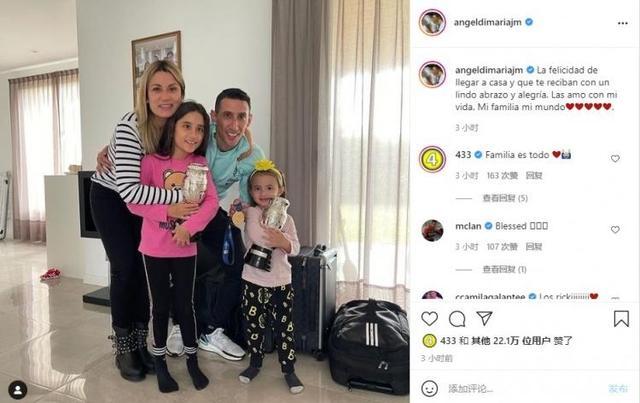 在帮助阿根廷问鼎美洲杯后,迪马利亚正与家人享受假期,他在社交媒体上晒出全家的照片,并写道:“回到家里、被美好的拥抱和喜悦迎接的幸福感,我用我的一生来爱你们,家人就是我的世界。”