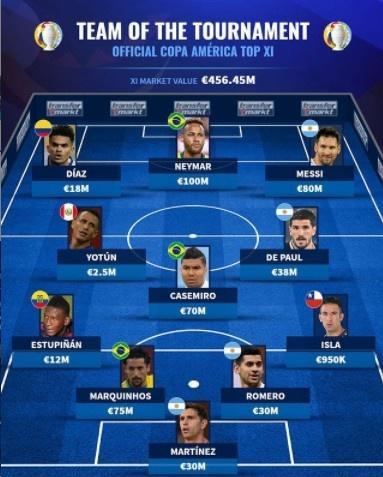 178直播讯 北京时间7月14日,德转列出了本届美洲杯最佳阵容中11名球员的现有身价,内马尔1亿欧最高,梅西8000万欧。
