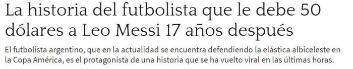 178直播讯 据西班牙媒体《阿斯报》报道,阿根廷报纸《奥莱报》出版的一本名为《梅西,不完整的天才》一书中披露,2004年梅西随阿根廷国青队参加比赛时,曾被队友阿尔瓦拉多领走了50美元的补贴,这笔钱至今没还。