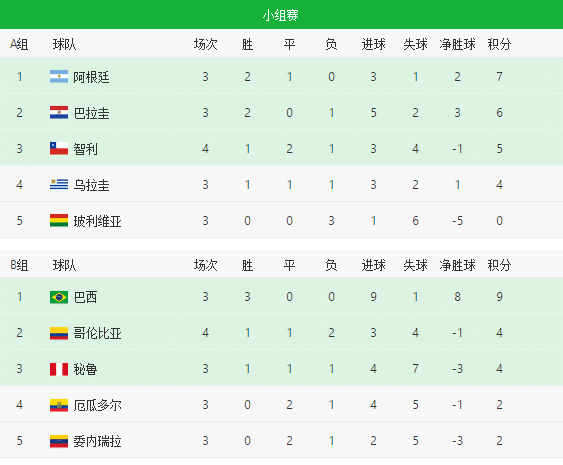 178直播讯 北京时间6月25日,美洲杯小组赛第4轮落下帷幕,这是小组赛倒数第二轮,本轮巴西队绝杀锁定小组第一,阿根廷轮空但此前已经成为第一支晋级的球队,乌拉圭终于取得胜利,智利队被巴拉圭爆冷击败,这样A组倒数第一0分的玻利维亚提前出局。美洲杯10支球队分为2个小组,小组倒数第一出局,8支球队晋级到淘汰赛。