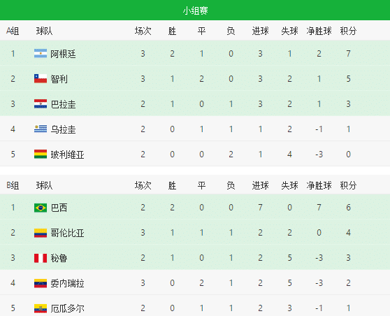 178直播讯 北京时间6月22日,美洲杯小组赛第三轮落下帷幕,本轮东道主巴西队延续出色发挥,阿根廷队也迎来连胜,提前晋级到淘汰赛。秘鲁击败哥伦比亚,厄瓜多尔和委内瑞拉战成平手。美洲杯的赛制是10支球队分为两个小组,前四名晋级到八强参加1/4决赛,然后就是单场淘汰赛决出冠军。接下来我们一起来看看美洲杯最新排名: