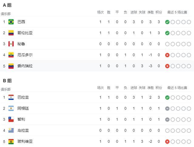 A组方面,东道主巴西首战3-0击败委内瑞拉,暂时排名第一,哥伦比亚1-0击败厄瓜多尔排名第二,还未踢比赛的秘鲁暂时排在第三。厄瓜多尔第四,委内瑞拉垫底。