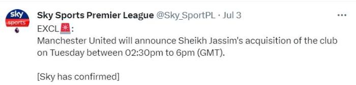 据信,该则报道可能源自一个冒充英国天空体育英超频道的社交账号,其早已宣称,曼联将于周二下午14:30到18点之间宣布谢赫贾西姆入主。这个账号与官方账号颇为相似,名称只有一个下划线的区别,很容易被误认。