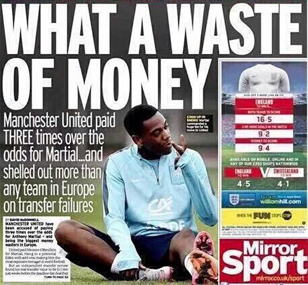 曼联最初为19岁的马夏尔支付了3600万英镑,根据出场情况,价格升至了4400万英镑,使他成为当时世界足坛最昂贵的20岁以下球员。曼联对法国人的天赋寄予厚望,但最终失望收场。