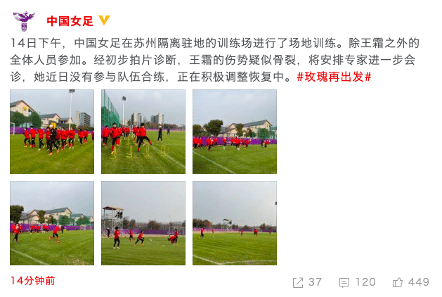 178直播02月15日讯 ,中国女足官方发布消息,球队的核心王霜经初步拍片诊断,伤情为疑似骨裂,国家队将安排专家进一步会诊。目前,在苏州酒店隔离的中国女足全队已经重返隔离驻地的训练场进行训练,但王霜并没有参加,她正在积极调整恢复中。