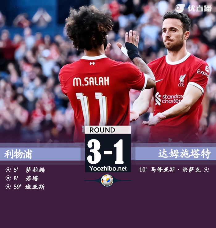 178直播讯 北京时间8月8日02:00,足球友谊赛利物浦迎战达姆施塔特的比赛,上半场萨拉赫门前推射得手,若塔挑射建功,洪萨克单刀扳回一城,下半场迪亚斯蝎子摆尾式进球,最终利物浦3-1达姆施塔特。
