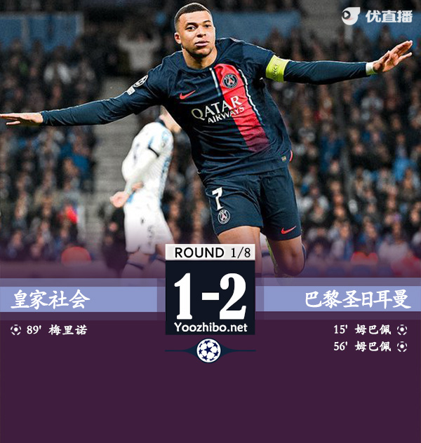 178直播讯 北京时间3月6日凌晨4时,欧冠八分之一决赛次回合,巴黎客场对阵皇家社会。上半场,姆巴佩抽射破门首开纪录。巴黎半场1-0领先皇家社会。下半场,姆巴佩再下一城,梅里诺最后阶段打进一球。最终巴黎客场2-1击败皇家社会,以两回合总比分4-1淘汰皇家社会,晋级欧冠八强。