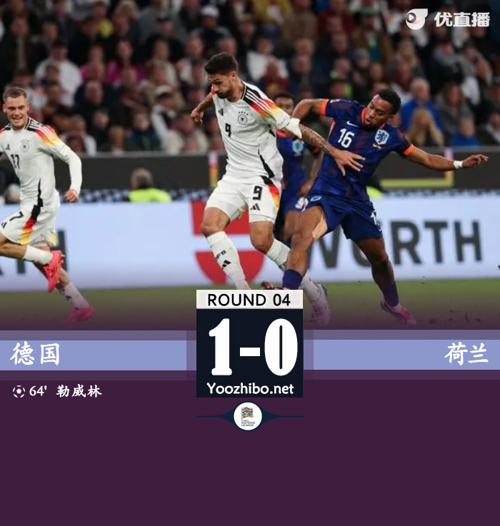 178直播讯 北京时间10月15日欧国联A联赛第4轮,德国主场对阵荷兰。上半场,勒威林闪击破门,但因越位被吹。下半场,勒威林爆射破门,国家队首秀斩获处子球!随后哈维-西蒙斯远射击中横梁。最终,德国队1-0战胜荷兰。