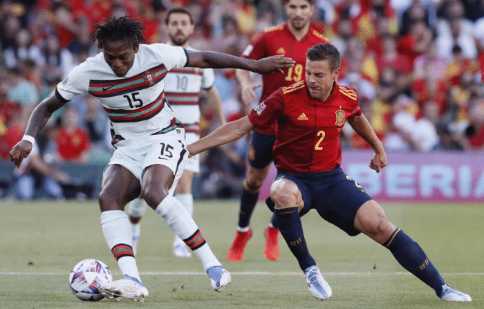 现在,还剩下B组的比赛未完成。北京时间9月28日凌晨2:45,B组的两场收官赛同时打响,葡萄牙主场对阵西班牙,瑞士主场对阵捷克。B组5轮过后,欧洲前冠军葡萄牙暂时以3胜1平1负10分的成绩排名第一,西班牙2胜2平1负8分排名第二,瑞士2胜3负6分排名第三,捷克1胜1平3负4分排名垫射。
