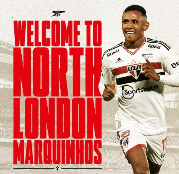 阿森纳官宣签下了19岁的射手马尔基尼奥斯,转会费为350万欧元,合同也是5年。马尔基尼奥斯2022赛季已经代表巴西球队圣保罗踢了18场比赛,打进了3球助攻1次,比上赛季24场1球2助的表现进步明显,阿森纳此次签约等于是在投资未来。