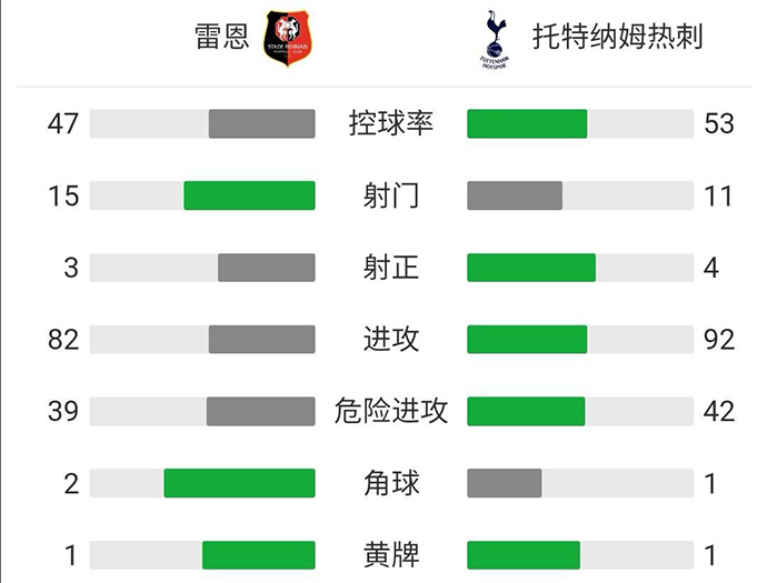 最终全场比赛结束,热刺客场2-2战平雷恩。