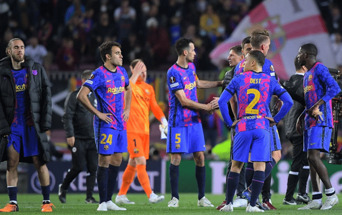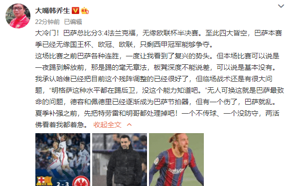 “大冷门!巴萨总比分3:4法兰克福,无缘欧联杯半决赛。至此四大皆空,巴萨本赛季已经无缘国王杯、欧冠、欧联,只剩西甲冠军能够争夺。