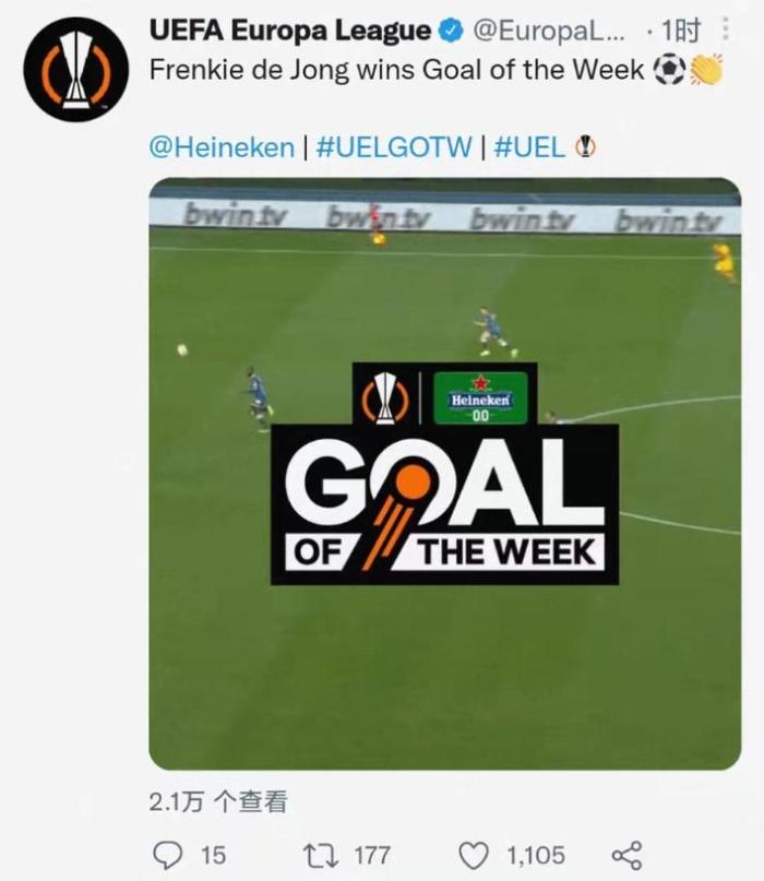对阵那不勒斯的比赛中,弗兰基-德容在上半场打入一脚世界波。这个进球被官方评为欧联本周最佳进球。