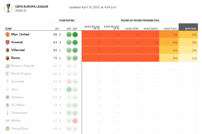 178直播4月16日讯 欧联杯四强出炉了,曼联、罗马、比利亚雷亚尔和阿森纳进入了欧联杯四强,而其中曼联将要对阵罗马,比利亚雷亚尔要对阵阿森纳,首回合的比赛在当地时间4月29日举行,次回合的比赛在当地时间5月6日举行(北京时间都要晚一天)。而其中,曼联和比利亚雷亚尔都是先主后客。而大数据网站“538”也更新了本赛季欧联杯夺冠的几率,其中曼联是最大的热门。