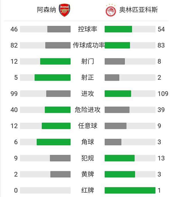 全场比赛结束,阿森纳本场0-1奥林匹亚科斯,总分3-2进8强。