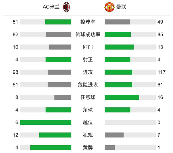 全场比赛结束,AC米兰0-1曼联,总比分曼联2-1米兰晋级八强。
