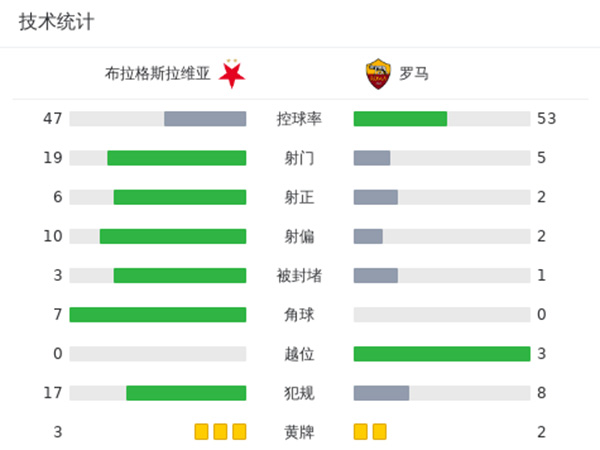 全场比赛结束,罗马0-2布拉格斯拉维亚。