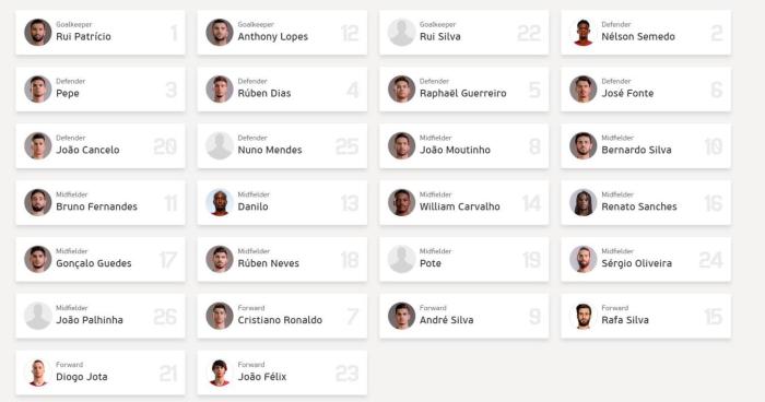 后卫:2-塞梅多,3-佩佩,4-鲁本-迪亚斯,5-格雷罗,6-若泽-冯特,20-若奥-坎塞洛,25-努诺-门德斯