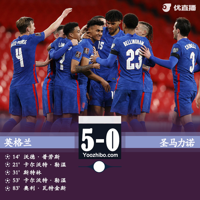 178直播3月26日讯 北京时间3月26日03:45,世界杯欧洲区预选赛I组首轮展开争夺,英格兰迎战圣马力诺。上半场,沃德-普劳斯打入国家队处子球,里斯-詹姆斯助攻勒温头球破门,芒特助攻斯特林扩大比分。下半场,林加德助攻勒温打进第4球,沃特金斯替补上场也打进国家队处子球,最终,英格兰5-0大胜圣马力诺,取得开门红。
