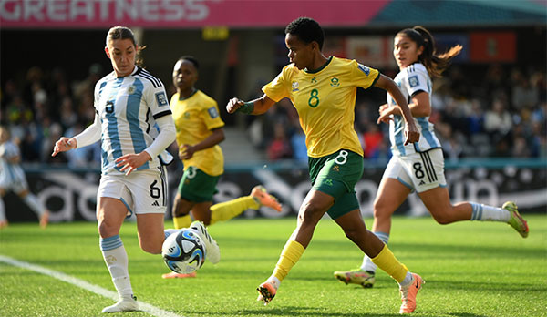 上半场南非女足的控球率虽然只有40%,但踢得更加间接高效。第12分钟,阿根廷后场出现失误,南非球员克加特拉纳单刀机会被破坏,她示意对手马约尔加有犯规,但裁判没有表示。第18分钟,阿根廷队角球进攻,被南非球员门线解围。