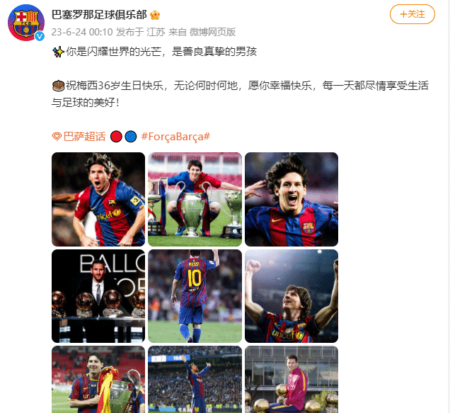 梅西生日,巴萨官方送上祝福,值得一提的是,这次巴萨卡点,他们选择在0:10分发布祝贺的内容,很显然梅西曾经是他们的10号球员。巴萨表示:“你是闪耀世界的光芒,是善良真挚的男孩。祝梅西36岁生日快乐,无论何时何地,愿你幸福快乐,每一天都尽情享受生活与足球的美好!”