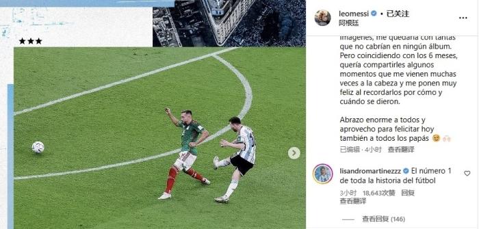 文末,梅西还借此机会祝全世界所有的父亲们节日快乐。截止到目前,梅西的这条动态已经获得点赞数接近600万。包括迪马利亚等多位阿根廷队友,也第一时间在评论区留言。因伤缺席了阿根廷本次亚洲行的曼联中卫利桑德罗-马丁内斯,也评论致敬道:“足坛历史NO1(GOAT)!”