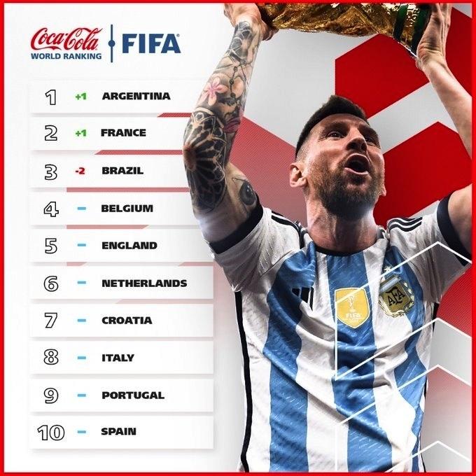 法国、巴西分列二三。第4至10名分别是比利时、英格兰、荷兰、克罗地亚、意大利、葡萄牙和西班牙。第11-20位分别是摩洛哥、瑞士、美国、德国、墨西哥、乌拉圭、哥伦比亚、塞内加尔、丹麦、日本。