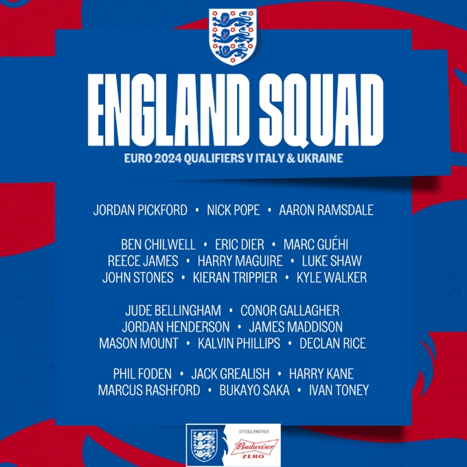 178直播03月16日讯 英格兰队公布世界杯后的第一期名单,主帅索斯盖特将率队征战欧洲杯预选赛。凯恩&拉什福德领衔名单,马奎尔、亨德森入选,托莫里、本-怀特、斯特林、阿诺德无缘。