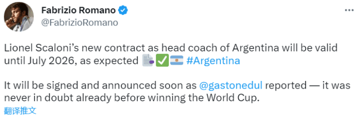 罗马诺表示,斯卡洛尼的新合同将持续到2026年7月,就像人们所期盼的那样。
